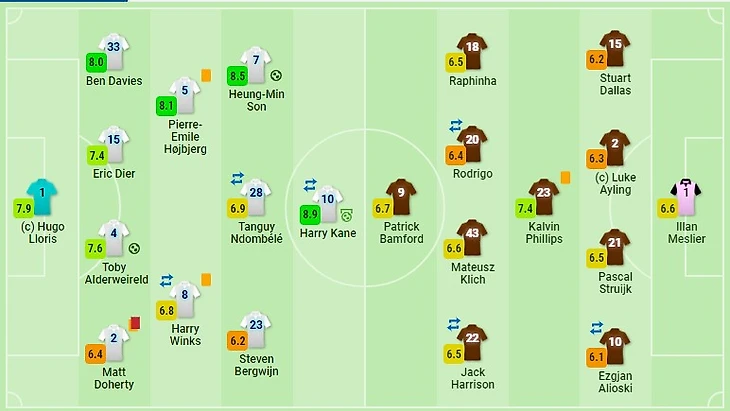 «Лидс» играл по привычной для себя схеме 4-1-4-1. «Тоттенхэм» также не отошел от своей классической схемы 4-2-3-1. Линия прессинга «шпор» находилась достаточно высоко на половине поля соперника. Кейн действовал по двум центральным защитникам, Сон оказывал ему помощь, играя и по крайнему, и по центральному защитнику. Тоже самое делал и Бергвейн на противоположном фланге.