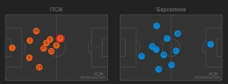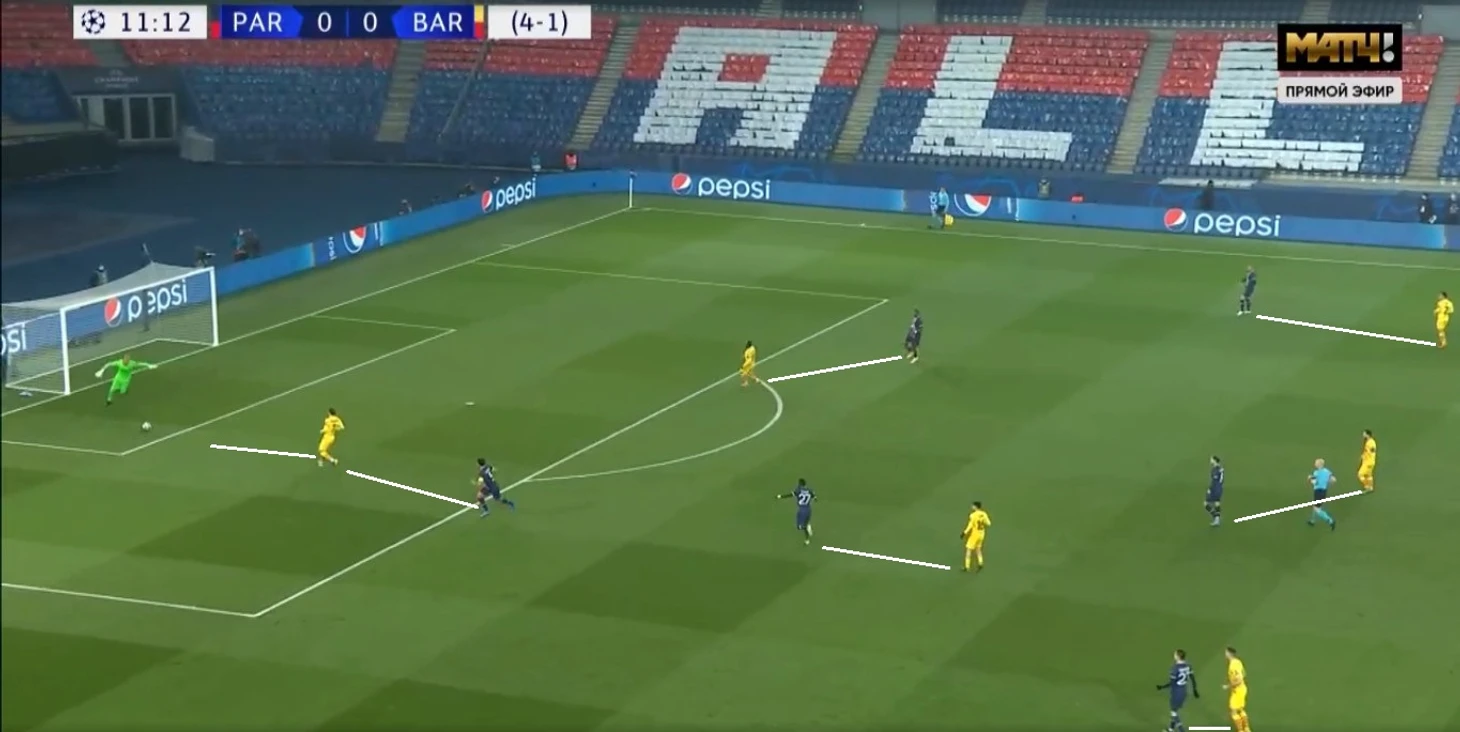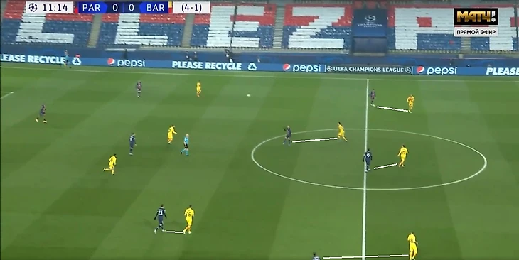При глубокой обороне вблизи своей штрафной площади парижане стремились насытить 14 зону, располагаясь компактно. При этом фланги для «Барселоны» оставались открытыми. Таким образом, каталонцы были вынуждены переводить мяч с края на край, в попытках растянуть оборону «ПСЖ» в центре. К слову, из семи ударов «Барселоны» из-за штрафной площади, пять были нанесены из 14 зоны, но все они были не опасными – либо мимо, либо заблокированы (ист. sofascore).