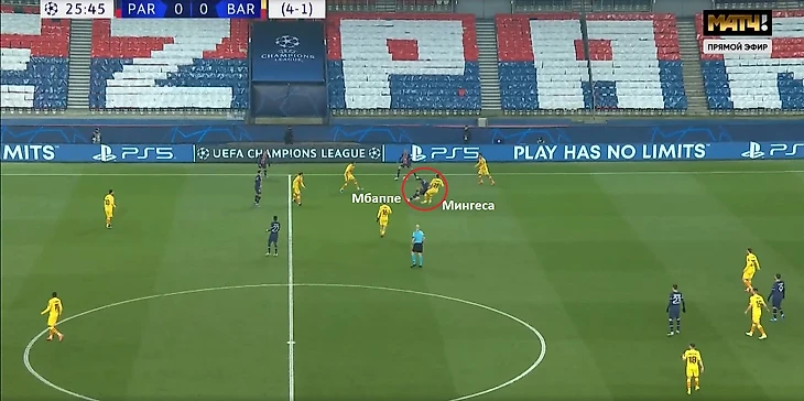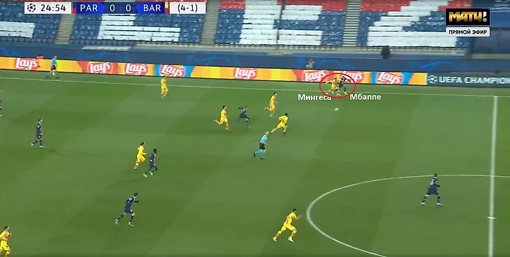 Несмотря на то, что «ПСЖ» в данной встрече сделала выбор в пользу контратакующего футбола, опасность со стороны Мбаппе сохранялась. При потере мяча у «Барселоны» оставались уязвимыми фланги в обороне. Наличие тройки центральных защитников слегка нивелировала данную слабость. Тем не менее, уже на 25 минуте встречи Оскар Мингеса получил желтую карточку за фол на Мбаппе. Француз стремительно набирал скорость, убегая в контратаку, когда как центральный защитник «Барселоны» уже проигрывал ему эпизод.