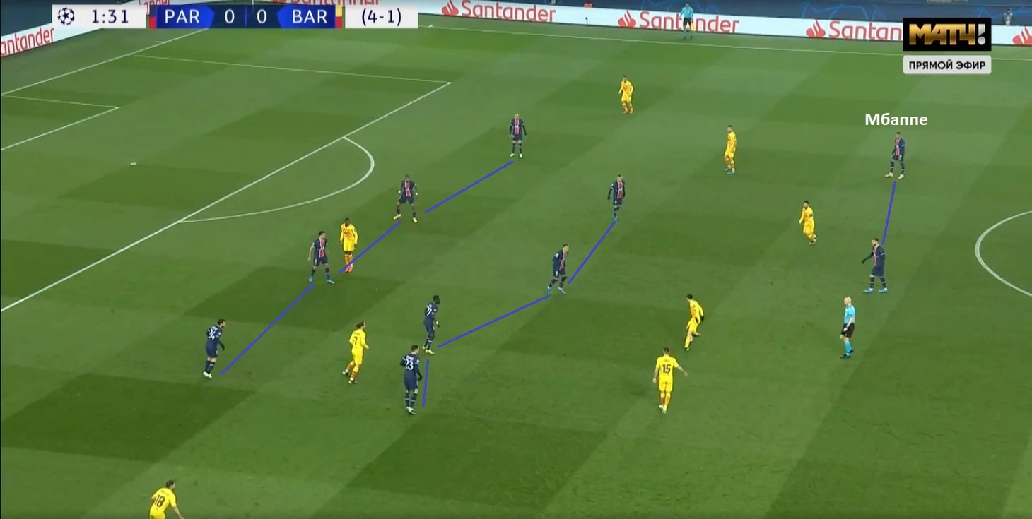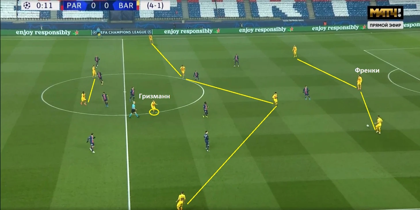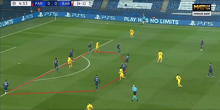 Так как «ПСЖ» на своей половине поля при обороне действовала достаточно компактно и надежно, у «Барселоны» был вариант для создания свободных зон за счет выманивания соперника в прессинг на свою половину поля. Таким образом, в центре становилось более свободно, и при выходе из-под давления через короткий пас, игроки атакующей линии атаковали пространства за спинами оборонительной линии.