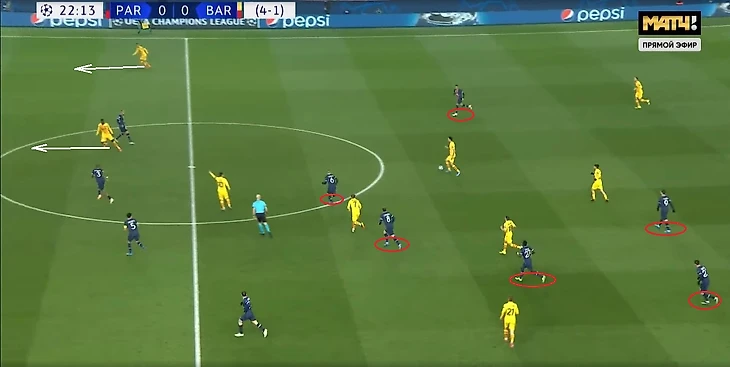 Без мяча каталонцы включали давление на игроков соперника. Здесь стоит отметить целостность при прессинге, которой не хватало «Барселоне» в прошлых играх, когда центр поля оставался абсолютно свободным. В этой встрече наблюдались персоналии при давлении на игроков «ПСЖ».