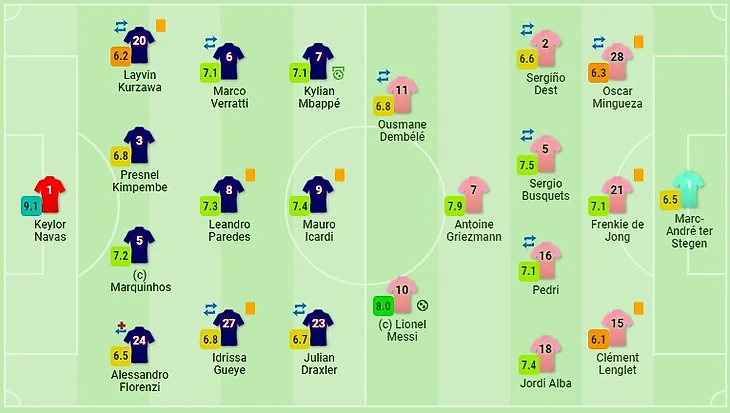 Главный тренер «Барселоны» все же решил сыграть тройкой в обороне, но за счет опускания Френки Де Йонга между Мингесой и Лангле. Альба и Дест, соответственно, поднялись выше по флангам. В линии атаки сыграла та же тройка игроков, что и в первой встрече против «ПСЖ»: Дембеле, Гризманн и Месси. Таким образом, схема расположения игроков 3-4-3/3-4-1-2.