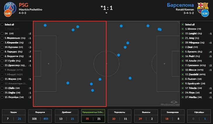 В целом, каталонцы достаточно быстро возвращали себе мяч как благодаря выигранным единоборствам, так и за счет активного насыщения зоны мяча при потере и мгновенным контрпрессингом соперника. Из 21 предпринятого отбора, 15 был успешными, причем 7 из них на половине поля «ПСЖ» (ист. whoscored).