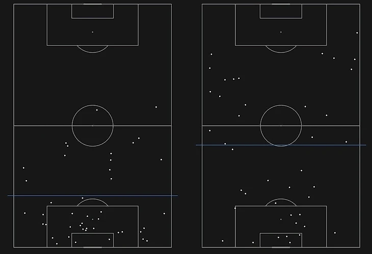 Интересным и достаточно парадоксальным выглядит средняя высота линии обороны «Барселоны». Особенно относительно высоты обороны «Атлетика». По сути это иллюстрация эффективности давления со стороны басков.