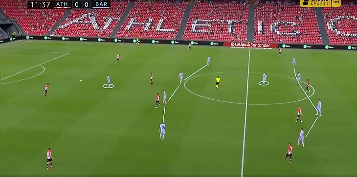 При розыгрыше мяча через фланг весь блок «Атлетика» смещался по мячу, стремясь усложнить дальнейшее развитие атаки через край, поджимая как пасующего, так и потенциального адресата Альба часто был вынужден играть длинными забросами вперед. Смещения Педри контролировались защитником «Атлетика», что еще более усложняло выход «Барселоны» из-под прессинга.