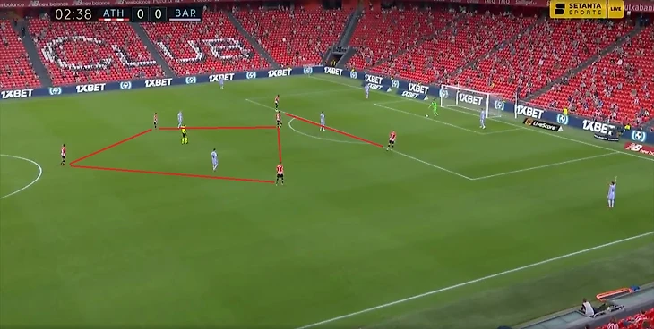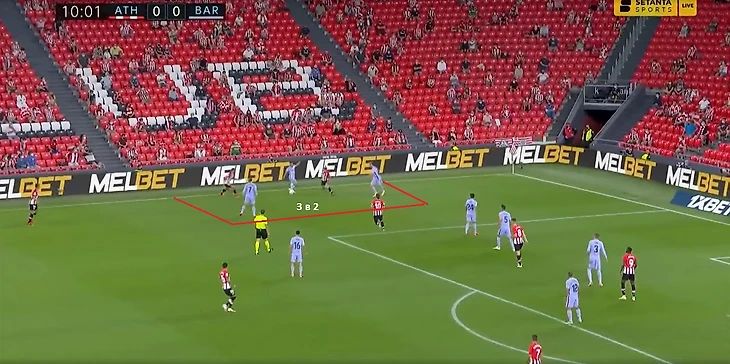 Вивиан и Мартинес заняты персонально Френки и Гарсией. При этом второй центральный защитник Араухо (заменивший Пике) блокирован полузащитником басков Дани Гарсия. Таким образом, зона перед Араухо остается открытой, и в неё готов вбегать Мартинес