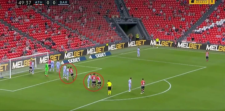Спустя пять минут после начала второго тайма «Атлетик» открыл счет после очередного корнера. После подачи Муниаина центральный защитник Мартинес оторвался от Эрика Гарсии и в прыжке переправил мяч в ворота «Барселоны». Здесь стоит отметить расположение игроков при розыгрыше.
