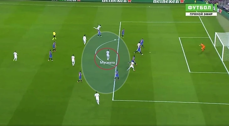 Обратим внимание на то, какая глубина атаки в итоге образовалась. Зона 14 для подбора открыта. Мусиала наносит удар, но мяч попадает в штангу, от которой отскакивает к Левандовски на добивание.