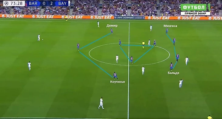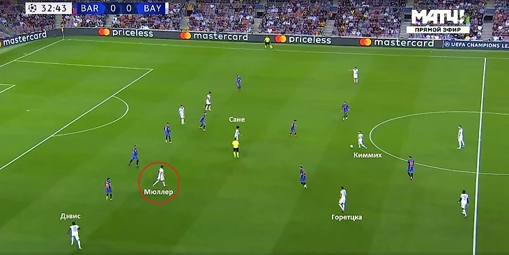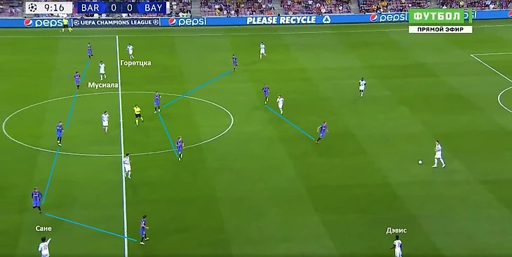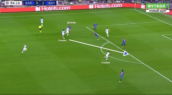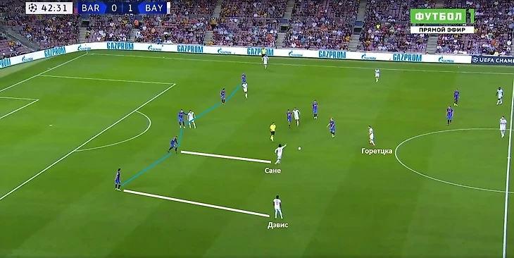 «Барселона» толком не могла активно продвигаться с мячом на чужую половину поля. Развертывание атак тормозилось, в результате приходилось откатываться в фазу обороны. При игре без мяча каталонцы на 5-3-2, Жорди Альба и Серхи Роберто опускались на флангах в линию к центральным защитникам. При продвижении мяча «Баварией» через левый фланг Роберто поднимался чуть выше, чтобы встречать Альфонсо Дэвиса. У испанца в этой встрече стояла задача нейтрализовать подключения своего прямого оппонента. Вероятно, Куман решил использовать пять защитников, чтобы лишить возможности соперника использовать всю ширину при атаке.
