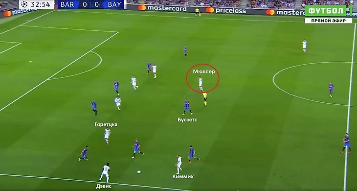 Постоянное активное присутствие в зоне 14 принесло баварцам успех. Первый гол пришел как раз из указанной зоны, но не из самого опасного её участка. Позиция Мюллера при ударе была достаточно низкой. Но ему дали возможность пробить по воротам, отдали пространство перед штрафной. Предлагаю детально рассмотреть этот эпизод, так как в течение 30 секунд было два ярких примера того, как каталонцы открывали зоны для соперника.