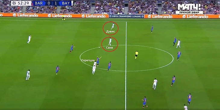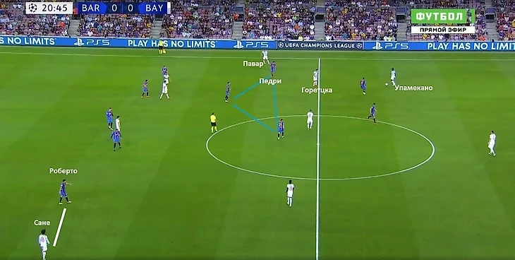 Дополнительный перегруз создает Павар, поднимаясь по флангу выше. Педри приходится отслеживать и движение француза, и перемещения Горетцки. Альба садится глубже, так как не может оставлять одного Гарсию против двух оппонентов. Таким образом, Упамекано имеет вариант с продвижением через Горетцка, с последующим переводом на Дэвиса. Очень много места получали игроки «Баварии» и перед линией обороны каталонцев. Узкое расположение тройки полузащитников позволяло Сане, либо Дэвису использовать пространство. Ни Роберто, ни Араухо не могли подниматься выше, так как держали позиции.