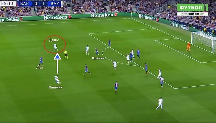Аналогичным приемом пользовался и Роберт Левандовски. В данном эпизоде развитие атаки пошло через левый фланг. На Дэвиса выдвигается Роберто, но центр открыт для передачи. Прессинг «Барселоны» не работал. Левандовски получает мяч и имеет возможность продвигать атаку дальше.