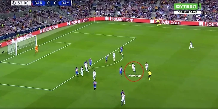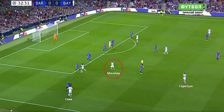 Киммих играет через Сане, который скидывает мяч на Томаса. Бускетс не успевает за эпизодом, а Мюллер наносит удар по воротам.
