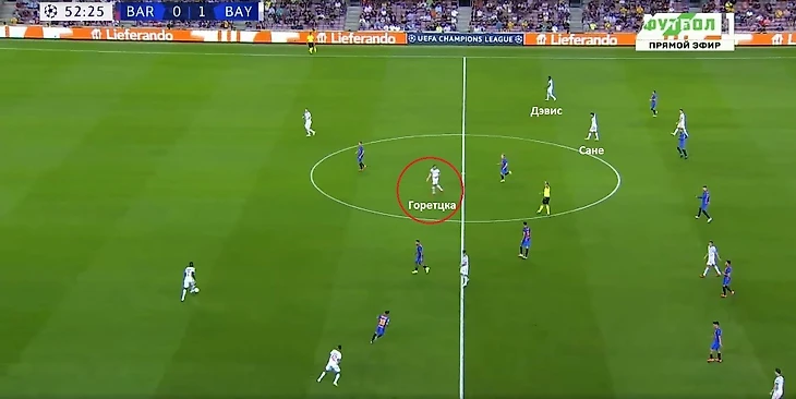 В подобных ситуациях стоит отметить и перемещения Горетцки. Он своевременно опускался ниже, оттягивая одного из хавбеков соперника на себя. При этом в полуфланговом коридоре оставались Сане и Дэвис, на которых, как мы понимаем, защитники старались слишком высоко не выдвигаться.