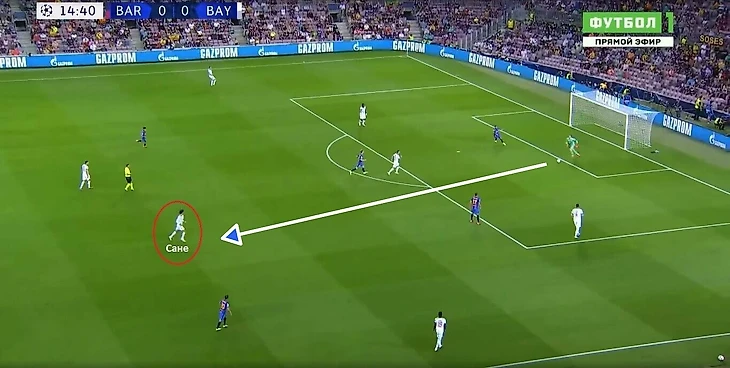 Как мы видим, центр для «Баварии» совершенно открыт. При таком расположении игрокам «Барселоны» неудобно прессинговать соперника. За несколько секунд до этого Араухо высоко поднимался за Сане, накрывая его при приеме мяча и вынуждая сыграть назад. Но он не мог так долго находиться рядом с немцем, иначе оставалась бы открытой зона за его спиной, и Пике был 1v1 с Мюллером. Смещения от Сане сделали выход из-под давления эффективным и безопасным.