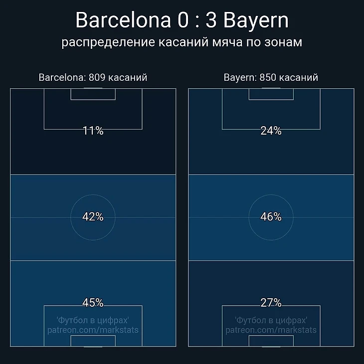 Один из статистических показателей по итогам матча, который вводит в заблуждение сильнее остальных, это процентное соотношение владения мячом. Оно составило 49% на 51%. Практически равное значение, однако если смотреть на картину в целом, то мы увидим, что «Барселона» владела мячом преимущественно на своей половине поля, и чуть меньше – в средней трети. «Бавария» же контролировала центральную ось, и примерно одинаково распределила количество касаний мяча в начальной трети и в финальной – 27% и 24%, соответственно.