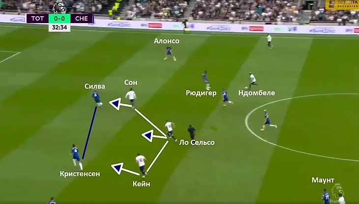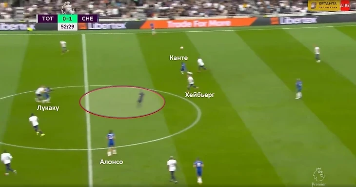 Испанец получит мяч транзитом через Сона и протащит его до чужой штрафной, но отдать обостряющую передачу не удастся, так как центральный защитник «Челси» заблокирует пас. Следующий пример: создание пространства между линиями «Челси».