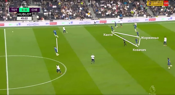 При построении атак «Челси» Канте располагался примерно на одной линии с Жоржиньо и Ковачичем. Таким образом, тройка полузащитников получала преимущество, складывалась ситуация 3v2.