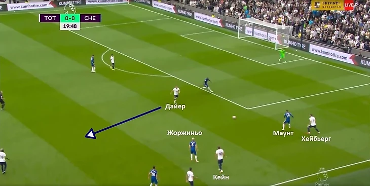 Здесь игроки «Тоттенхэма» вытягивают на свою половину поля соперника, глубоко сместился даже Кейн, который с мячом привел за собой Жоржиньо. Капитан отдал передачу Хейбьергу, который пасом на Дайера отрезал Маунта от эпизода. В итоге перед центральным защитником есть пространство для продвижения мяча.