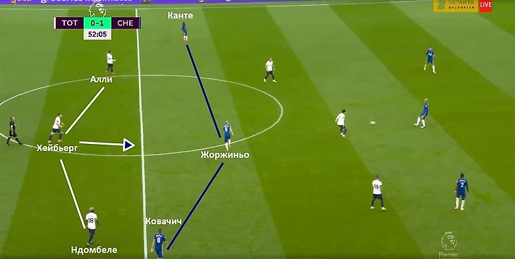 Жоржиньо высоко поднялся для давления на Хейбьерга. Маунт тоже готов включиться в прессинг, чтобы исключить возможность передачи на Деле Алли. Открывается огромная зона на границе средней и финальной трети, которую, например, может использовать Ндомбеле.
