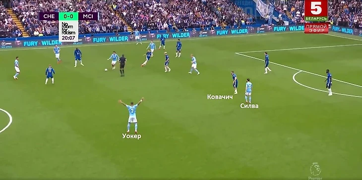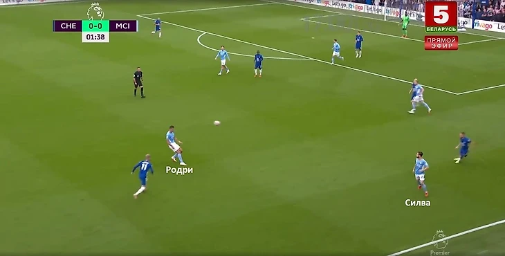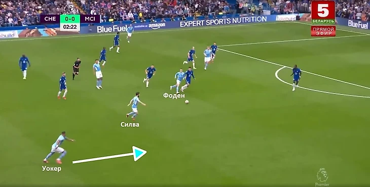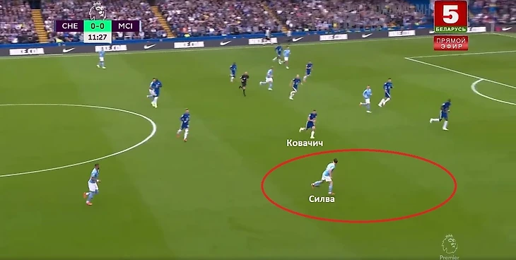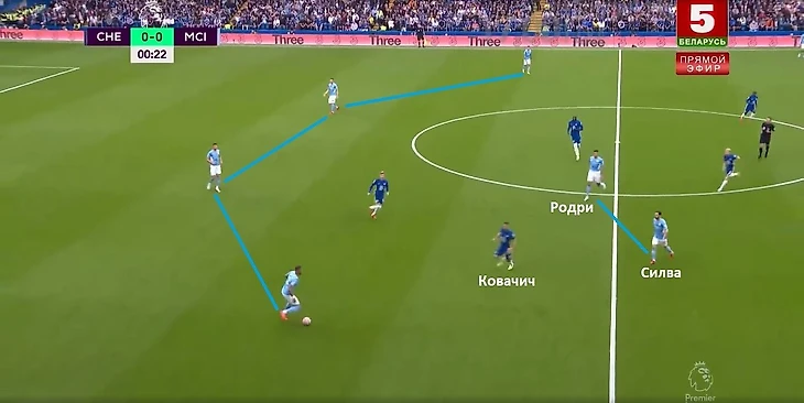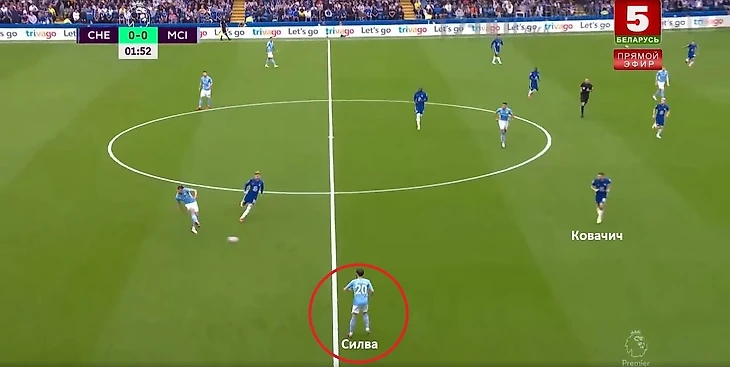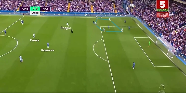 Передача идет между линий на Фодена, который едва его не теряет, находясь под давлением двух игроков. Ковачич неудачно играет в отборе, что позволяет англичанину скинуть мяч на свободного Силву. К нему также из глубины готов подключаться Уокер.