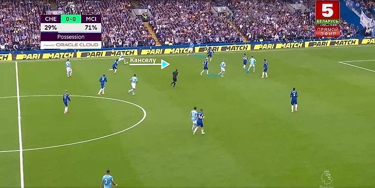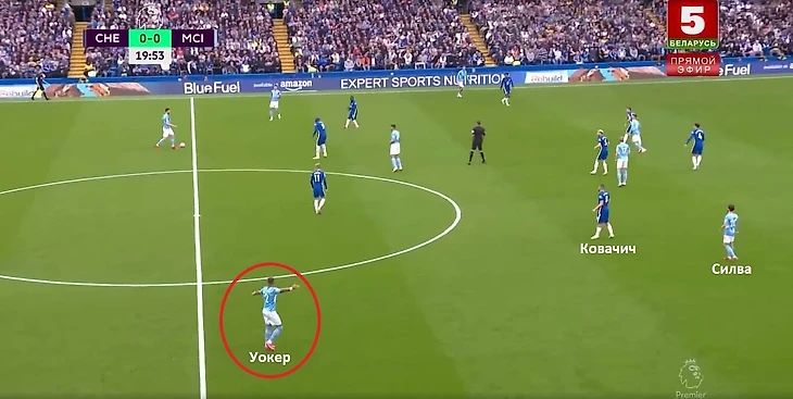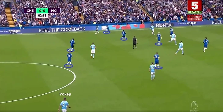 Здесь мы видим, что при переводе атаки «горожан» на левый фланг «Челси» компактно стянулся по мячу. На противоположном крае, что логично, свободным остается Уокер, который может как открыться шире, так и включиться в полуфланг в зависимости от развития атаки.
