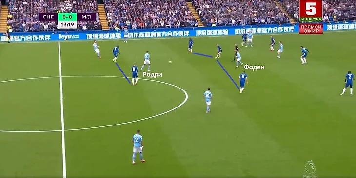 По сравнению с матчем против «Саутгемптона» в прошлом туре Пеп Гвардиола внес некоторые изменения в состав на игру с «Челси». В опорную зону вернулся Родри, в атаку – Фоден и де Брюйне. Томас Тухель также внес изменения в состав. Пару Лукаку в атаке составил Вернер. В центре поля расположилась тройка в лице Ковачича, Жоржиньо и Канте. На позиции правого латераля вышел играть Джеймс, а Аспиликуэта разместился под ним в роли правого центрального защитника. Кристенсен, соответственно, действовал ближе к центру обороны. На вратарской позиции также было изменение: Менди вышел играть с первых минут вместо Кепы, который защищал ворота в матче против «Тоттенхэма». С первых минут мы могли наблюдать план каждой из команд на игру. Гости в привычной для себя манере были намерены доминировать во владении мячом с постоянным поиском и созданием пространств для продвижения к воротам соперника. Кроме того, для них было важно контролировать центр поля, в том числе и без мяча – при потерях включался интенсивный контрпрессинг, усложнявший «Челси» выход в контратаки. Хозяева, в свою очередь, отказались от высокого и интенсивного прессинга на чужой половине поля. Подопечные Тухеля выстраивались в оборонительный блок 5-3-2 преимущественно на своей половине поля. Задача – отбор мяча с быстрым переходом из обороны в атаку через уязвимые зоны «Сити» на флангах, что логично, учитывая высокое расположение линии защиты гостей, особенно – фулбеков. В целом, на этом можно было закругляться с обзором матча. Особенно, если взглянуть на статистику первого тайма, где у обеих команд наблюдаются унылые нули в графе «удары в створ». Однако во втором тайме «Сити» прибавил, начал находить створ ворот, тогда как у хозяев ничего не поменялось. Какие детали повлияли на ход встречи?