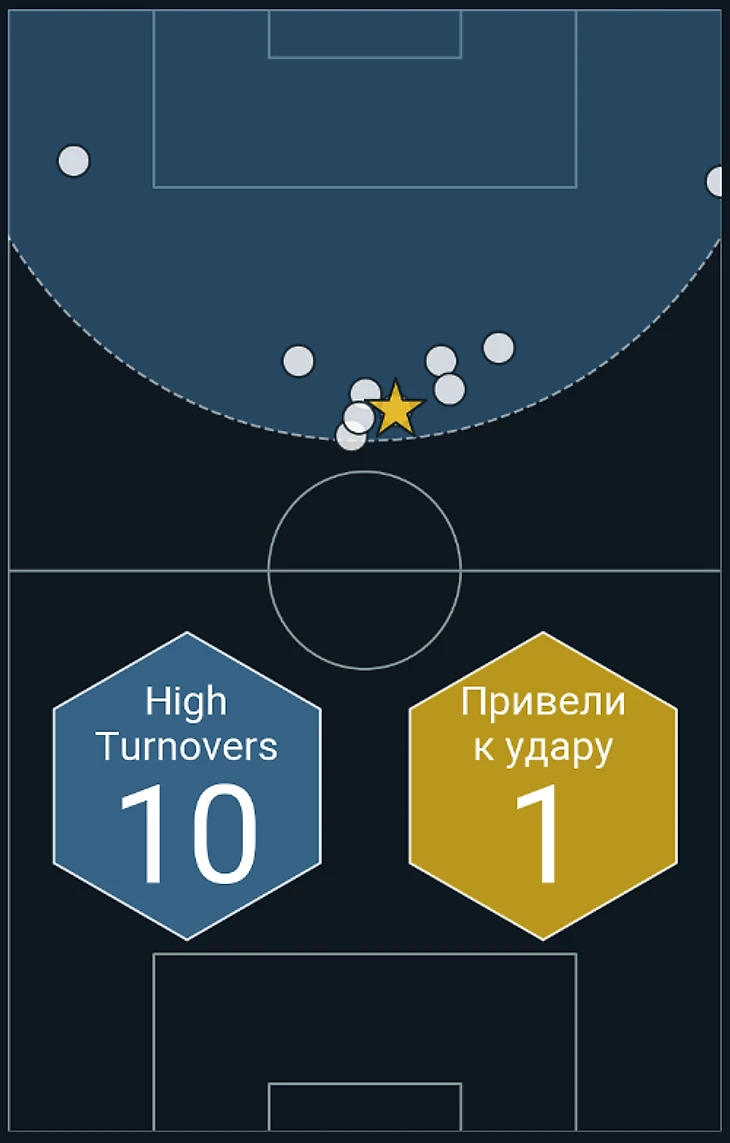 Обратим внимание на расстояние между игроками и их численное присутствие в зоне мяча во время давления. Все расположены компактно, что вынуждает игроков в синем работать быстрее, а, следовательно, повышает вероятность ошибиться.