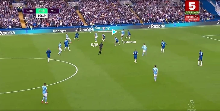 Другой вариант тоже предусматривал освобождение бровки – Грилиш смещался в центр, а Фоден или де Брюйне опускались ниже под передачу.