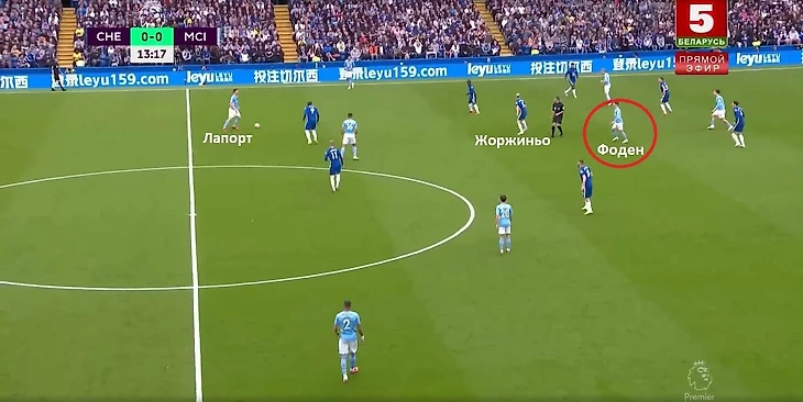 Жоржиньо смещается еще немного вправо и полностью открывает вектор передачи на Фила. Лапорт пользуется этим и отдает пас на англичанина, отрезая две линии «Челси».