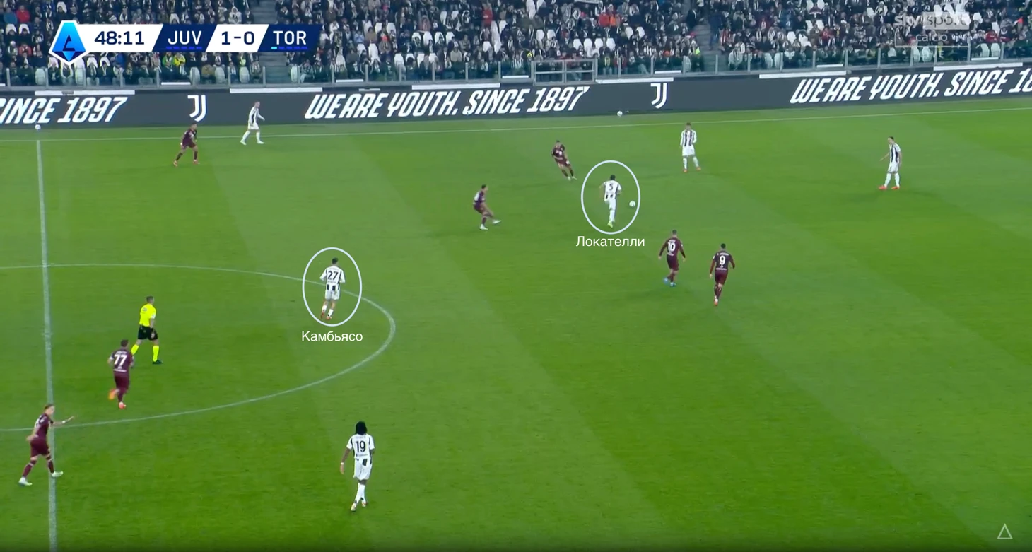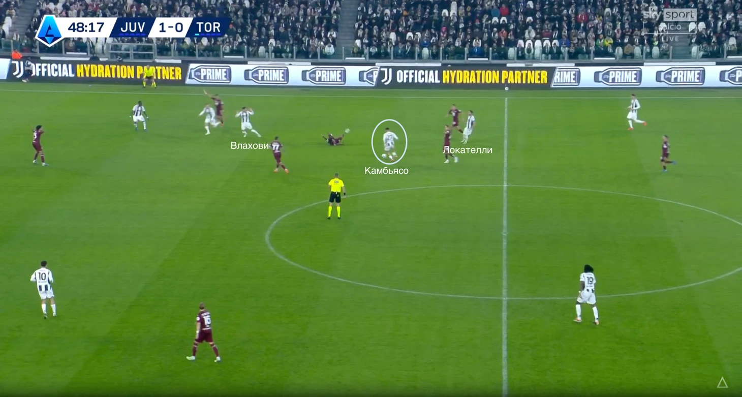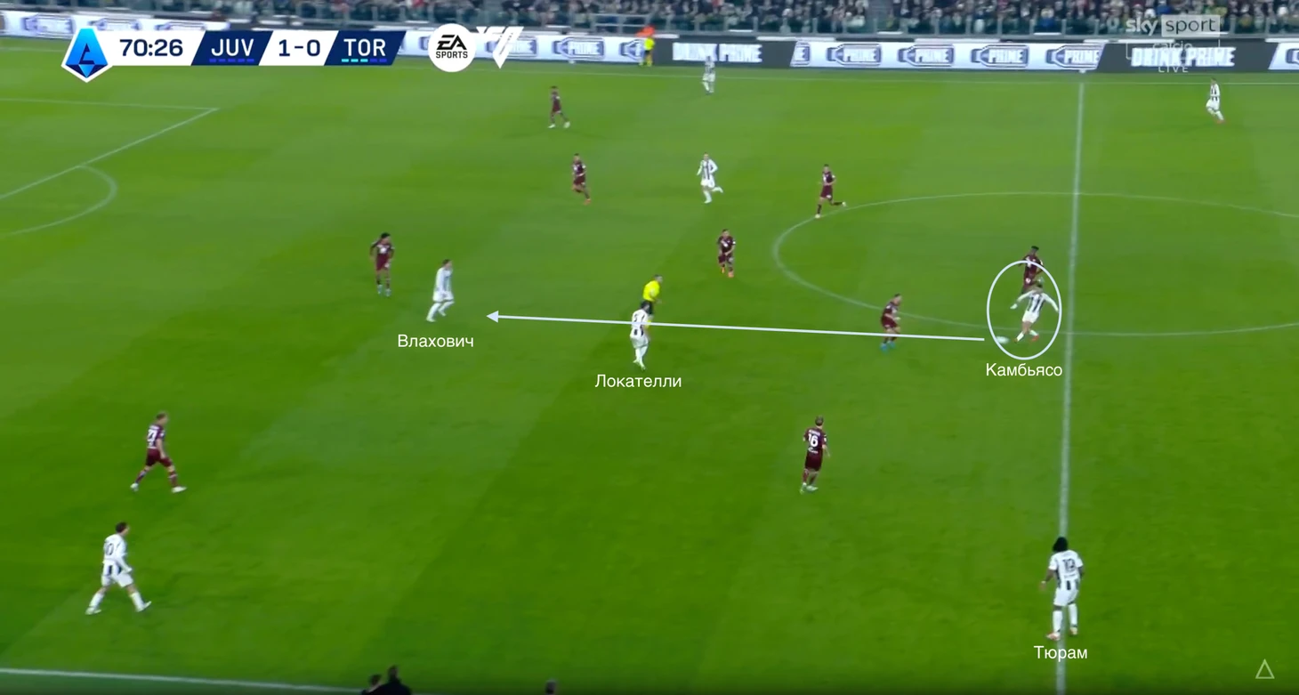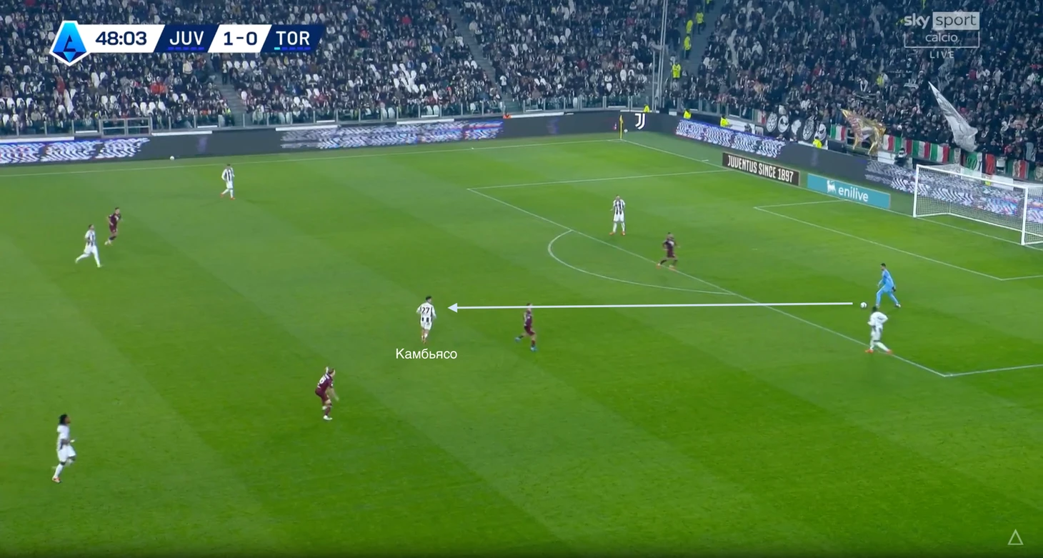 Как итог, в данной ситуации Камбьязо отдает передачу на Локателли, у которого сохраняется игровое расстояние между оппонентом. Опорный полузащитник «Ювентуса» в касание отправляет мяч вперед по флангу на флангового нападающего в лице Йылдыза – прессинг преодолен.