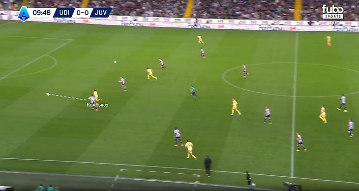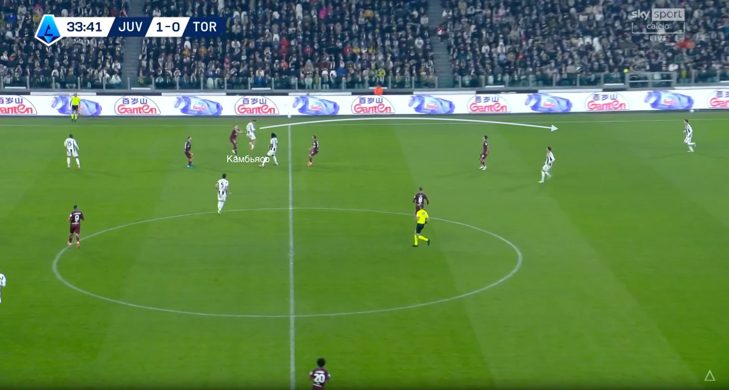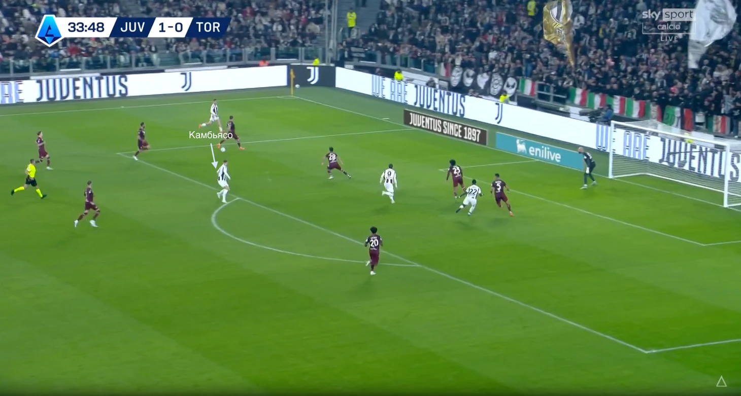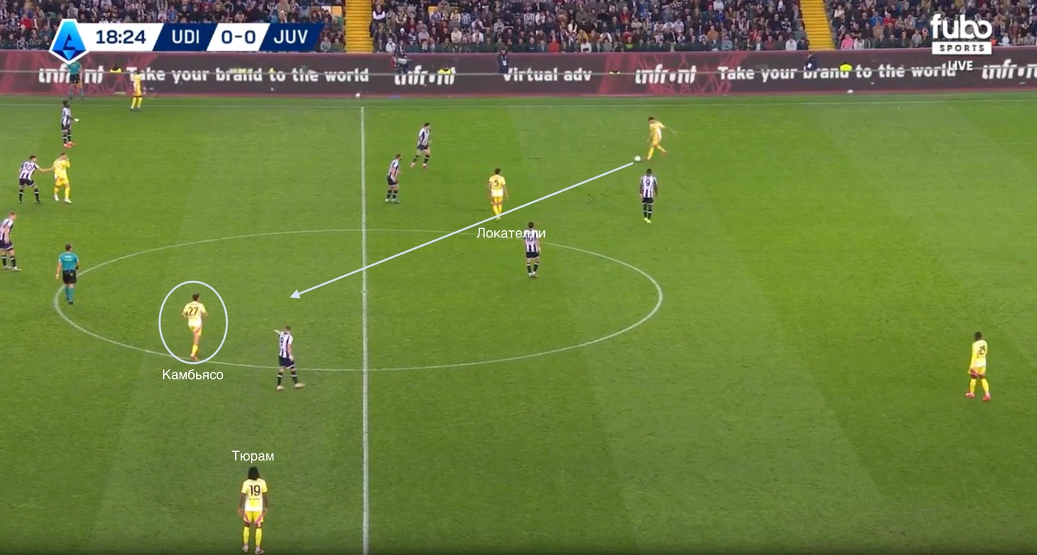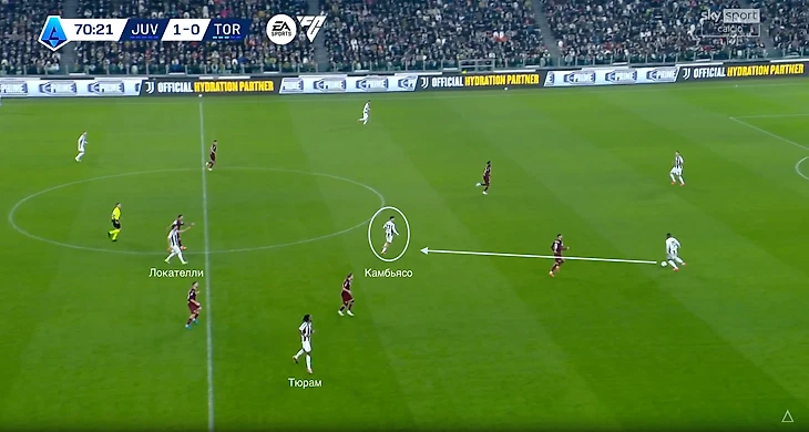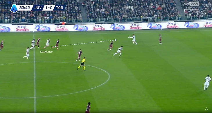 Как итог, в данной ситуации Камбьязо отдает передачу на Локателли, у которого сохраняется игровое расстояние между оппонентом. Опорный полузащитник «Ювентуса» в касание отправляет мяч вперед по флангу на флангового нападающего в лице Йылдыза – прессинг преодолен.