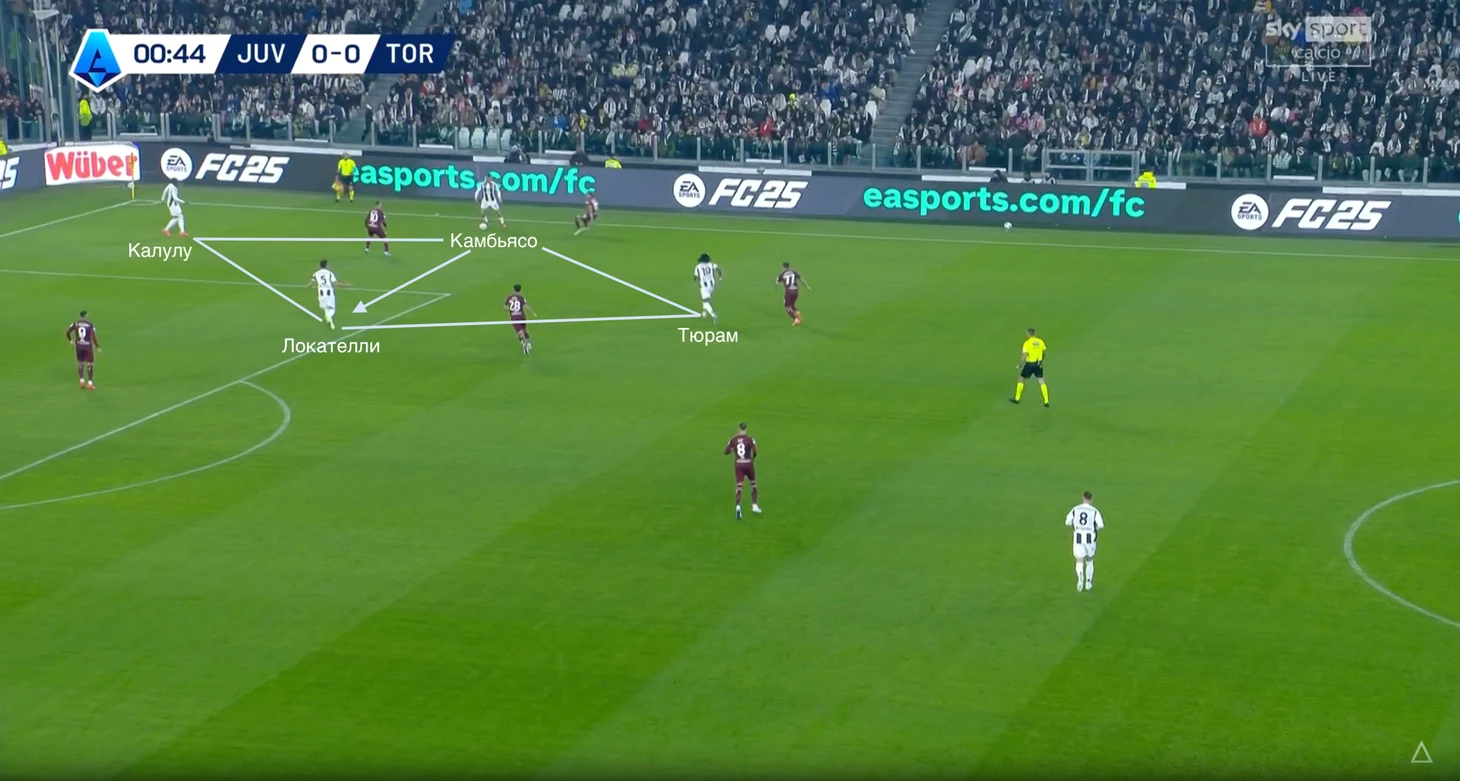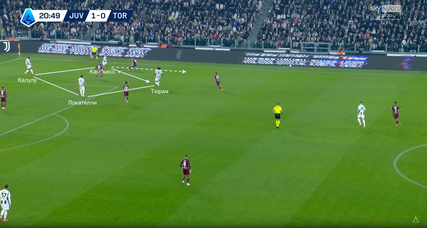 В первой зоне (начальная треть поля «Ювентуса») при выходе из-под высокого прессинга соперника Андреа занимает четкую позицию крайнего защитника, не поднимаясь высоко по флангу, что важно. Таким образом, он выстраивает ромб с партнерами в лице Тюрама в полуфланге, Локателли в центре и Калулу по правую ногу от него. Складывается ситуация 4v4, при этом открывается пространство между прессинг-группой и линией обороны соперника. Для этого Тюрам и приводит за собой игрока.