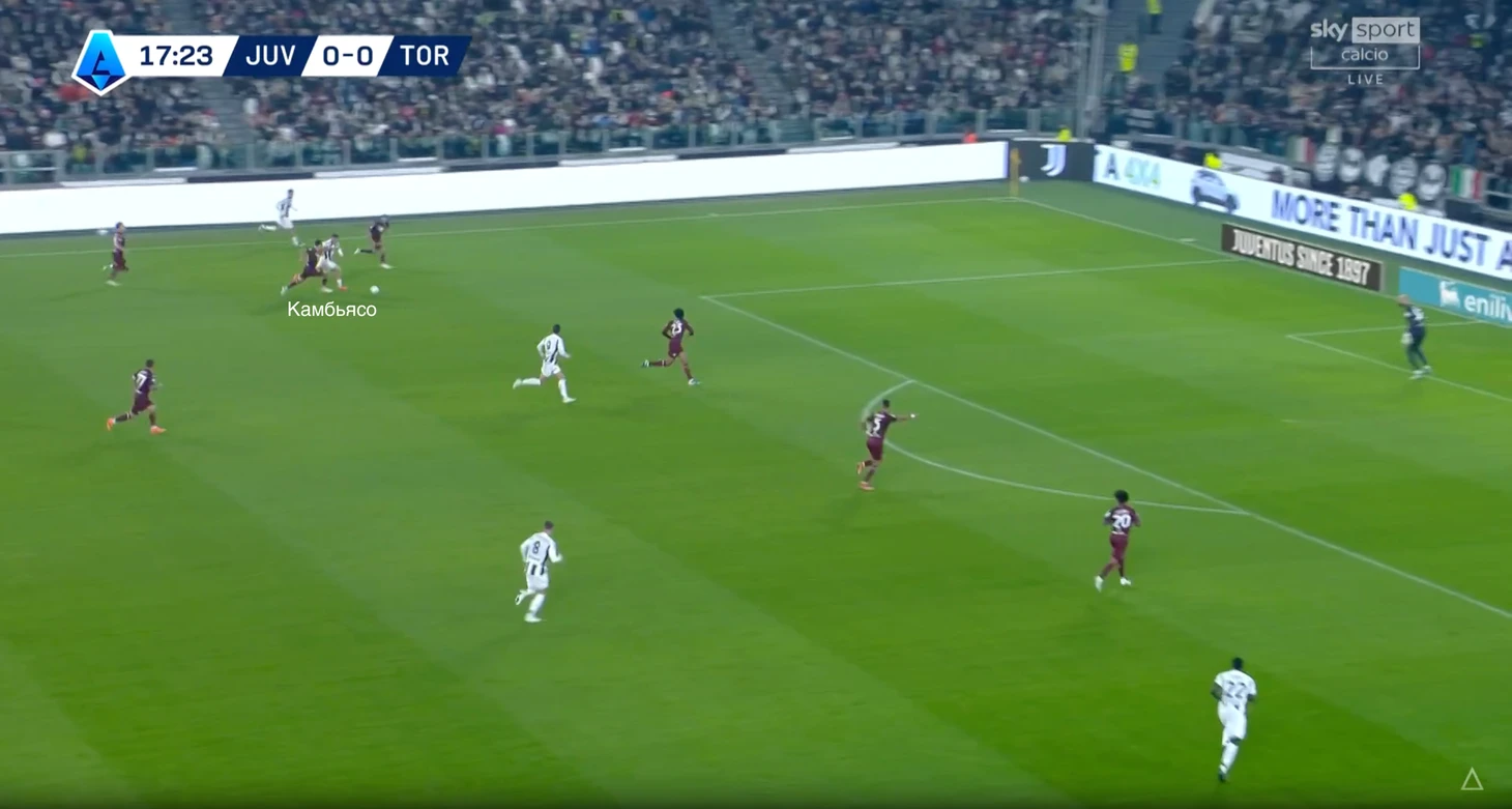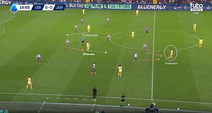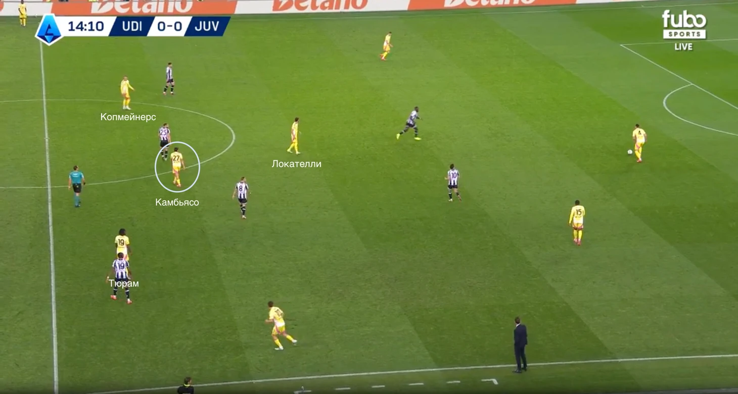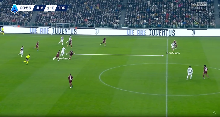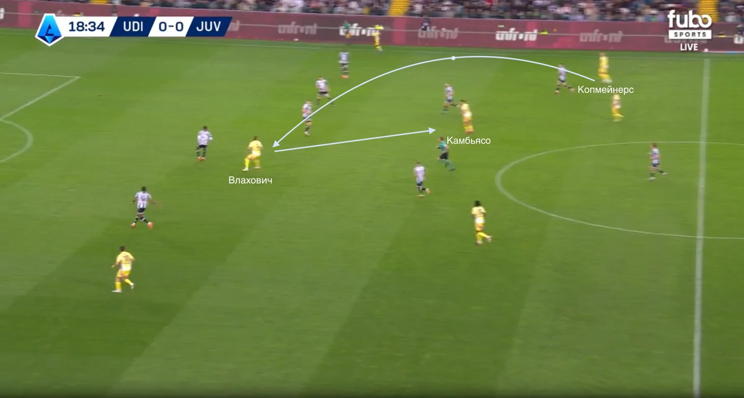 Копмейнерс увидел включение своего крайнего защитника в атаку и отдал ему передачу. Таким образом, «Ювентус» вышел из-под давления на ворота соперника с подключением Камбьязо из глубины.