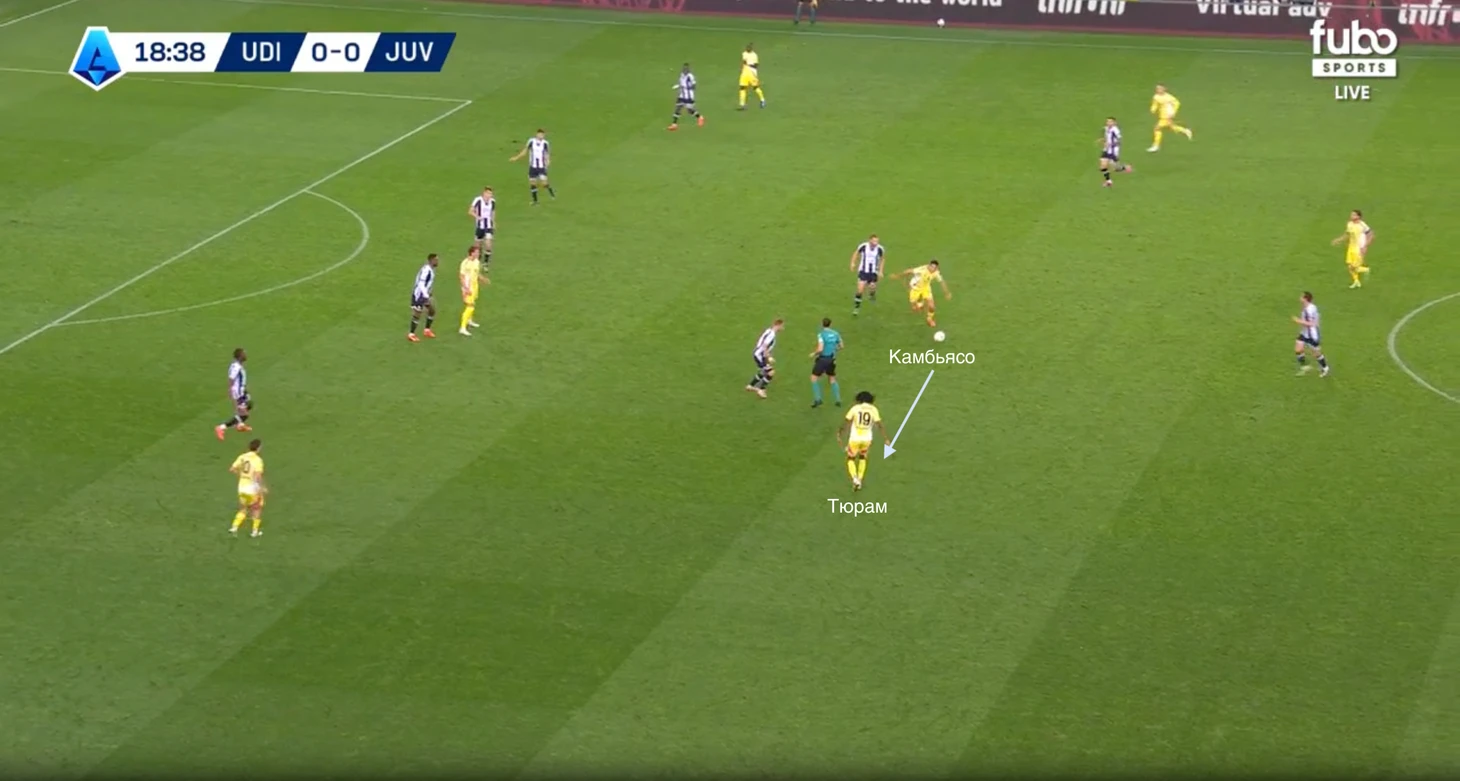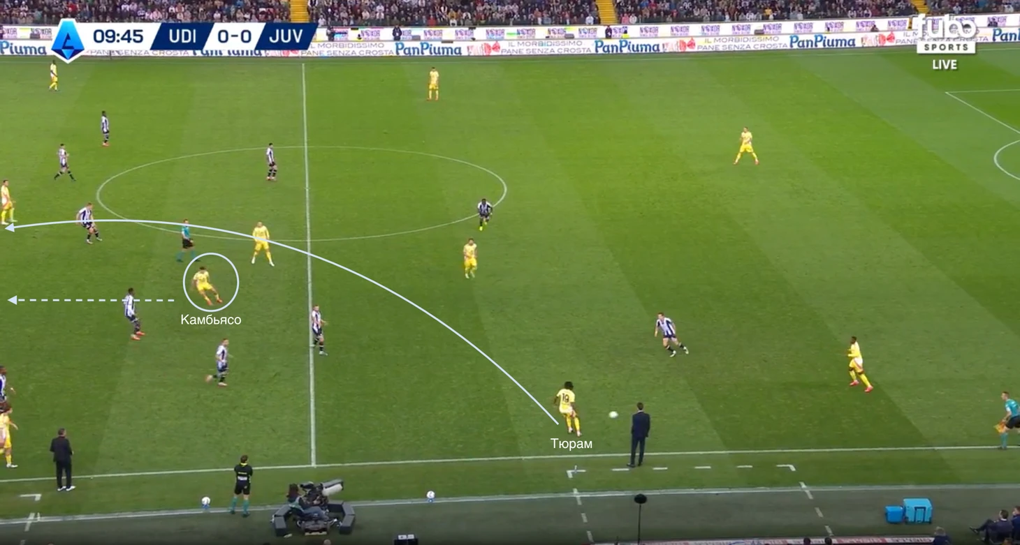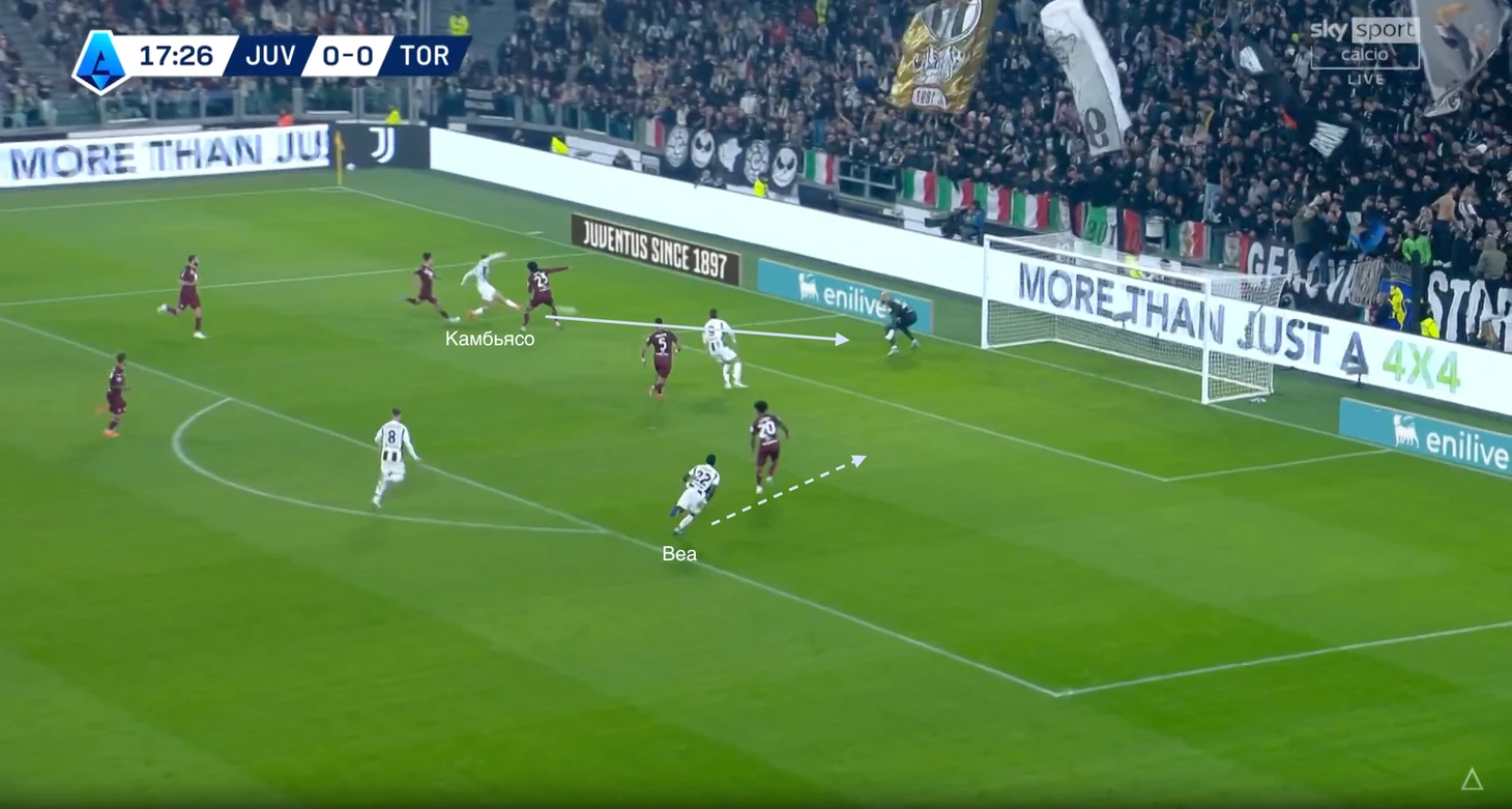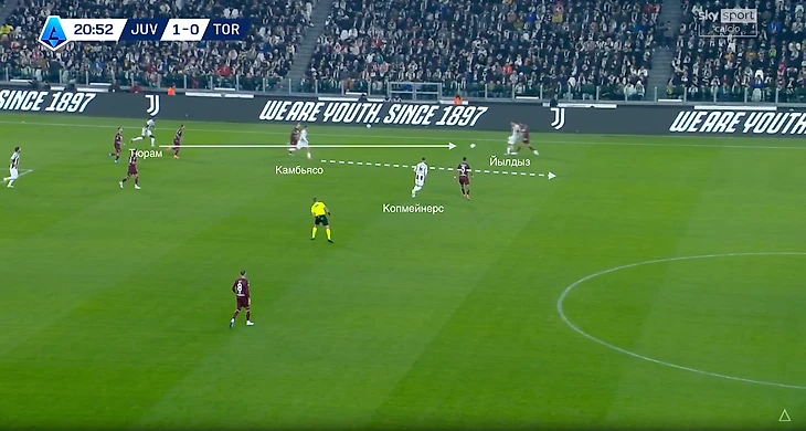 Копмейнерс увидел включение своего крайнего защитника в атаку и отдал ему передачу. Таким образом, «Ювентус» вышел из-под давления на ворота соперника с подключением Камбьязо из глубины.