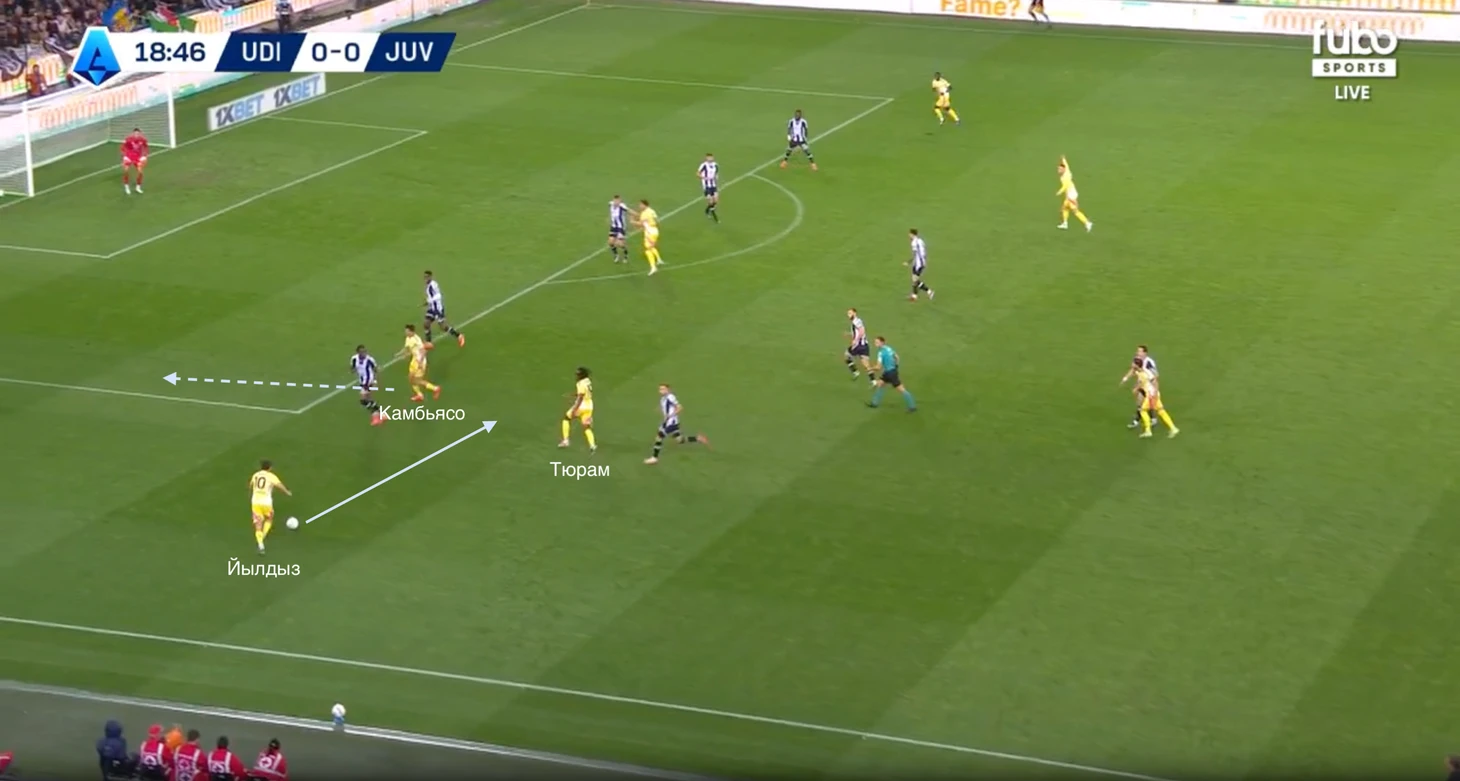 Здесь вклад Андреа не заканчивается. Своим движением он создает два варианта для Йылдыза: отдать на него в полуфланг штрафной площади, но центральный защитник «Удинезе» уже будет на спине висеть, или отдать в центр на Тюрама, который находится лицом к воротам и ближе к створу, что звучит более рационально.