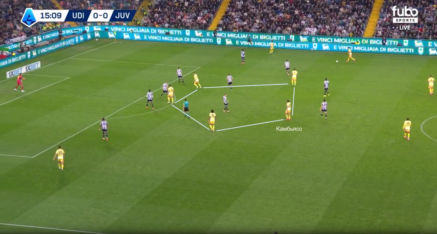 Такая позиция Камбьязо дает возможность команде перегружать среднюю линию соперника, создавая численное преимущество, посредством которого всегда будет свободный игрок для движения мяча.