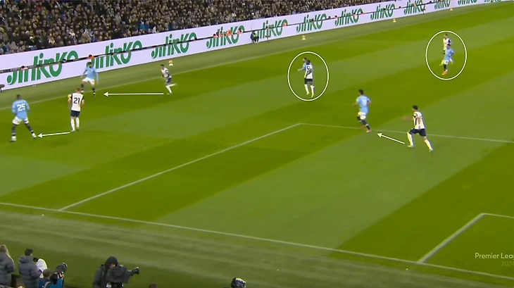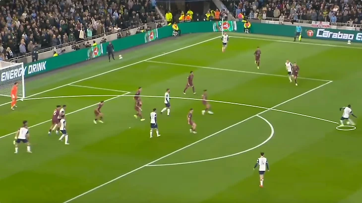 Первый гол «Сити» пропускает после неэффективного прессинга, который «шпоры» преодолели через свой правый фланг. В итоге, хозяева вышли на ворота 3v2.