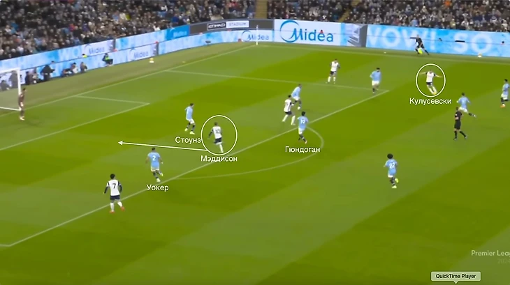 Первый гол – включение Мэддисона из глубины в зону между Уокером и Стоунзом (правый фланг обороны «Сити») + Гюндоган не доработал по нему и стал передавать его Стоунзу + легко дали сделать заброс от Кулусевски.