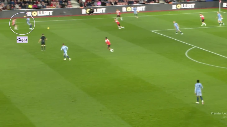 Ещё один пример, который характеризуется уже конкретной голевой ситуацией. Очередная попытка активного давления на чужой половине поля закончилась для «Саутгемптона» возвратом мяча и организацией собственной атаки. Эпизод закончился опасным прострелом от Райана Мэннинга.