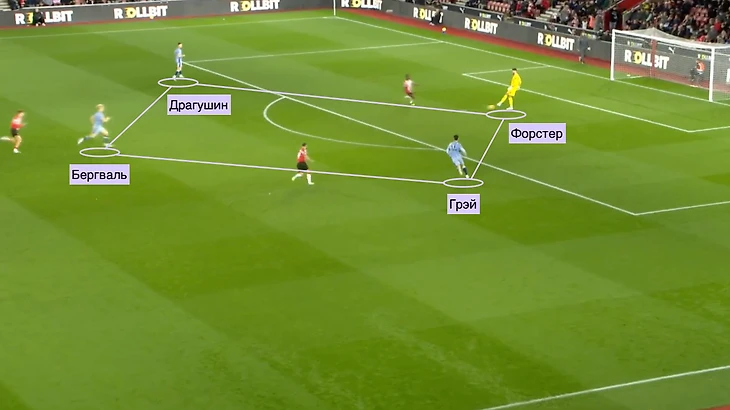 «Саутгемптон», в свою очередь, имел возможность создать голевой момент не только в переходных фазах. Один такой эпизод случился, когда «святые» организовывая свою атаку в своей начальной трети, сумели вскрыть через центр оборонительный блок «Тоттенхэма».