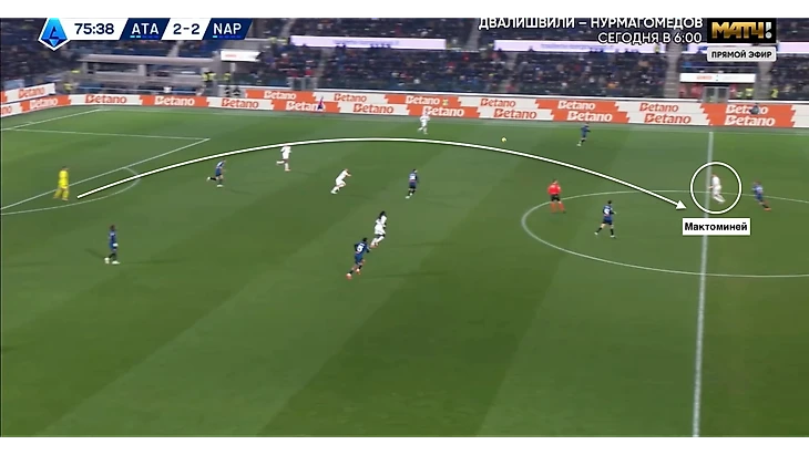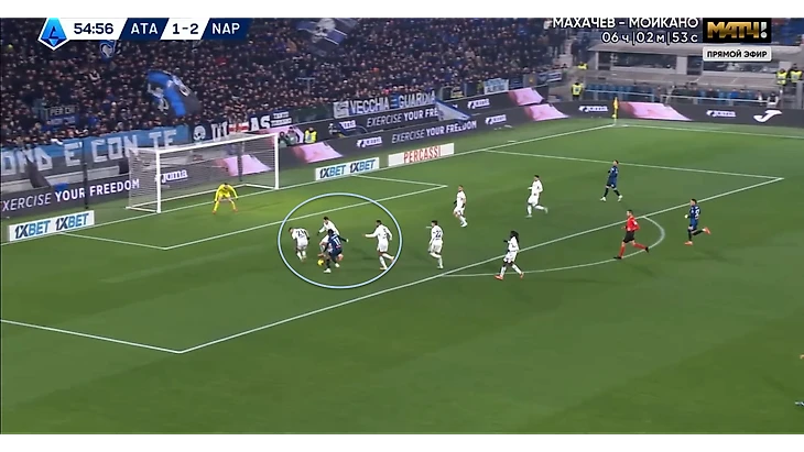 Давление, которое началось при переходе «Наполи» из нижнего блока в средний, привело к попытке «Аталанты» вскрыть оборону соперника забросом вперед. Как итог, переходная фаза, которую «Наполи» свел в результативную контратаку на ворота соперника.