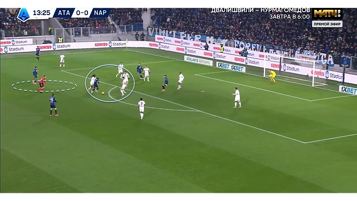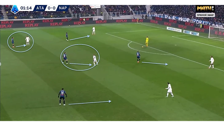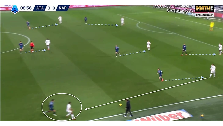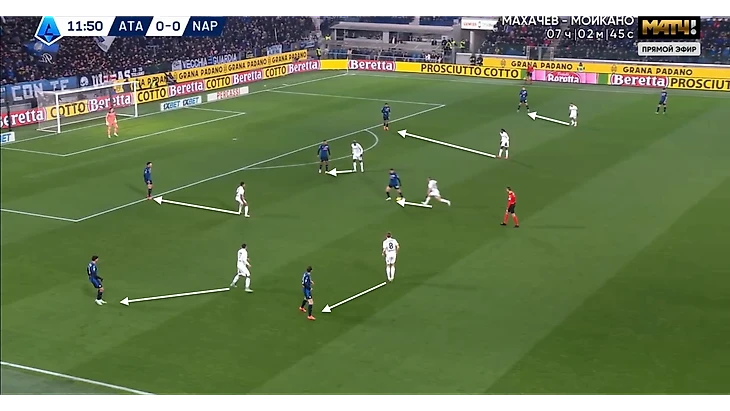 Что касается фланговых зон, прессинг «Аталанты» и там характеризовался активностью и агрессивностью, что также приводило «Наполи» к трудностям с развитием и продвижением атаки, а «Аталанту» – к финальной трети поля соперника.