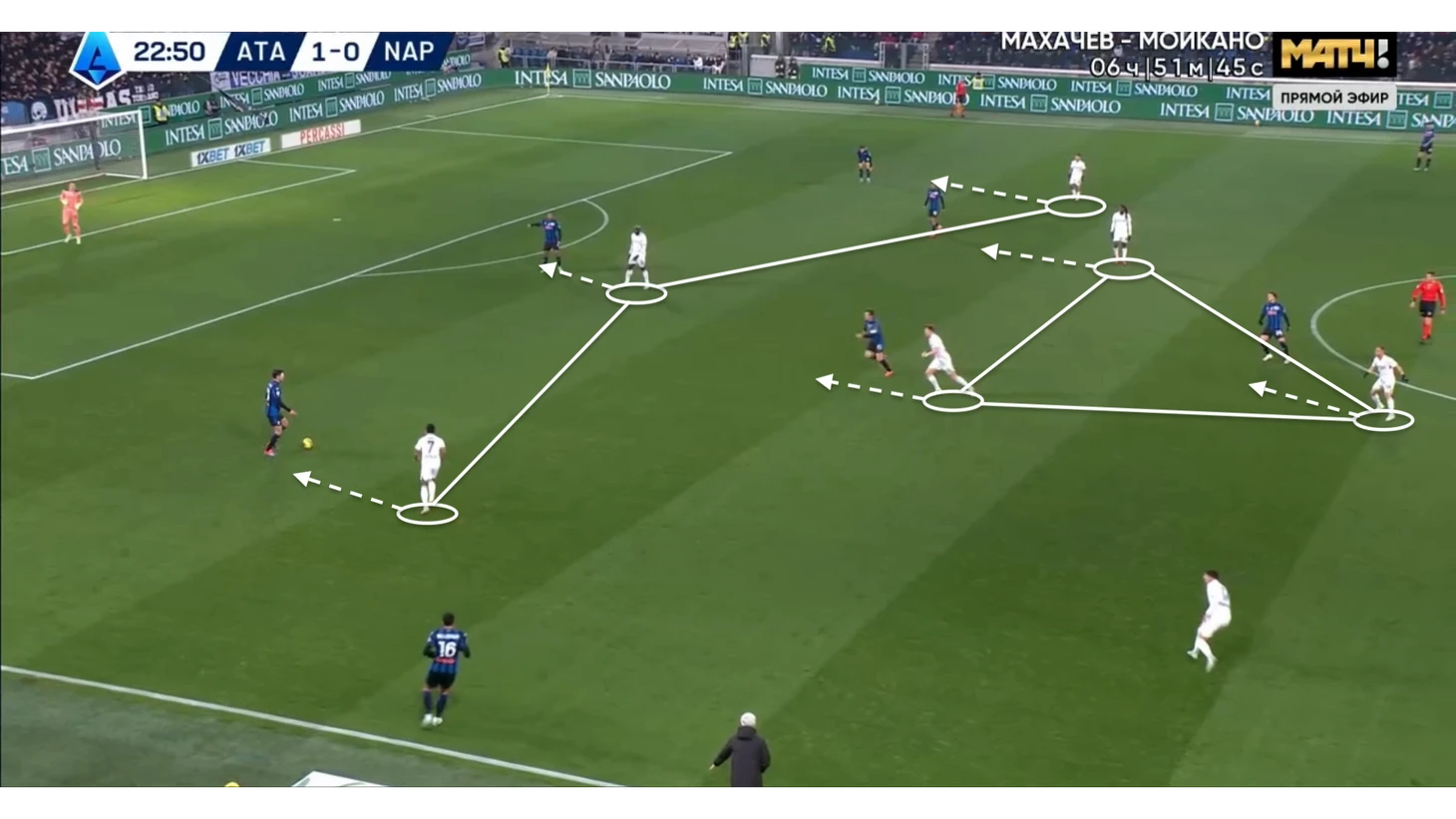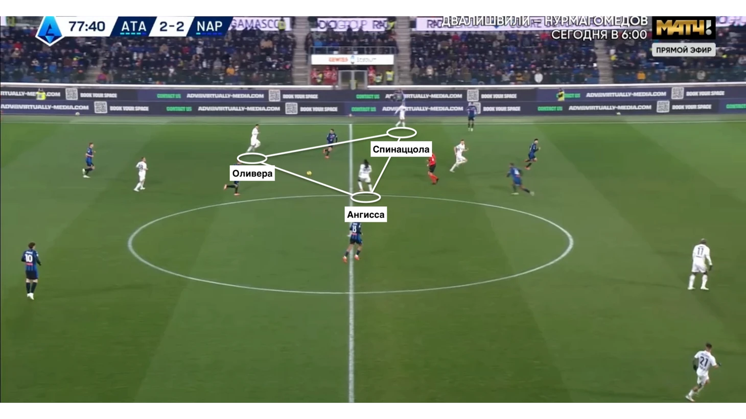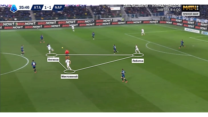 Для помощи при выходе через центральную зону ниже опускались Ангисса и Мактоминей, создавая поддержку для опорного полузащитника «Наполи» Станислава Лоботка.