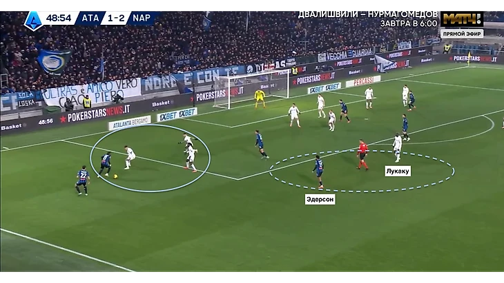 То же самое можно было наблюдать и в средней трети поля, когда прессинг группа «Аталанты» принимала решение не подниматься высоко. Плотно разбирали игроков в центре, затрудняя «Наполи» продвигать атаку по центру. Выходом могли быть направления передач на Лукаку через фланги.