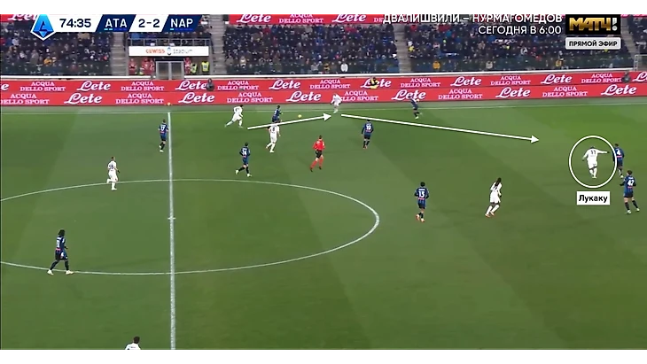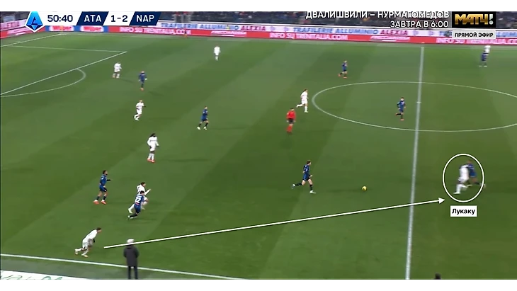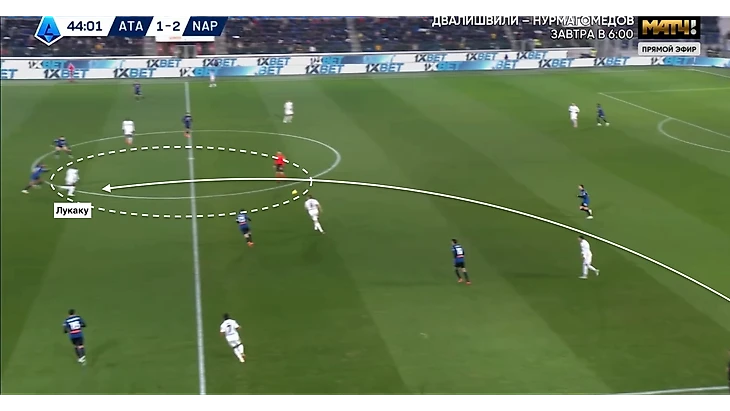 Кроме этого, доставка мяча на Ромелу Лукаку могла идти и с флангов. Таким образом, «Наполи» пробовал использовать зону в центре поля, которая открывалась в структуре построения в следствие прессинга «Аталанты».