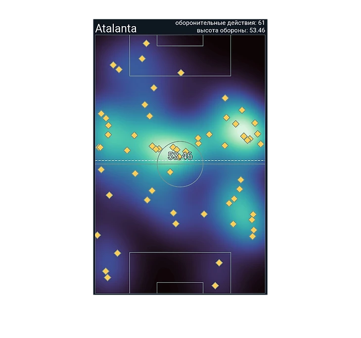 Если посмотреть на карту оборонительных действий «Аталанты», мы также можем убедиться в том, что команда достаточно много отборов совершила на чужой половине поля.