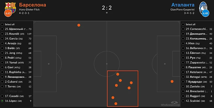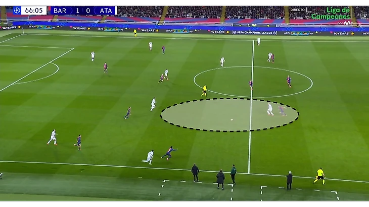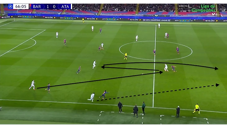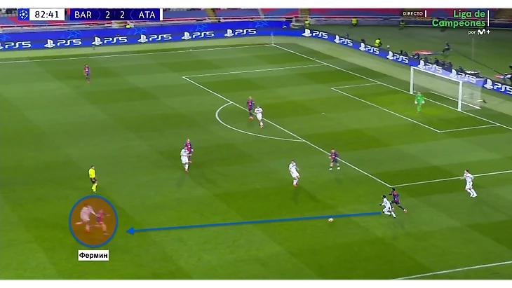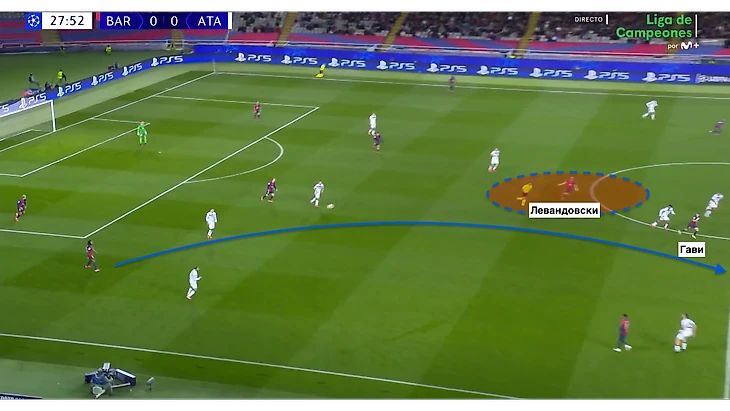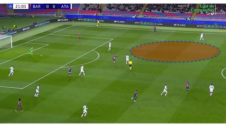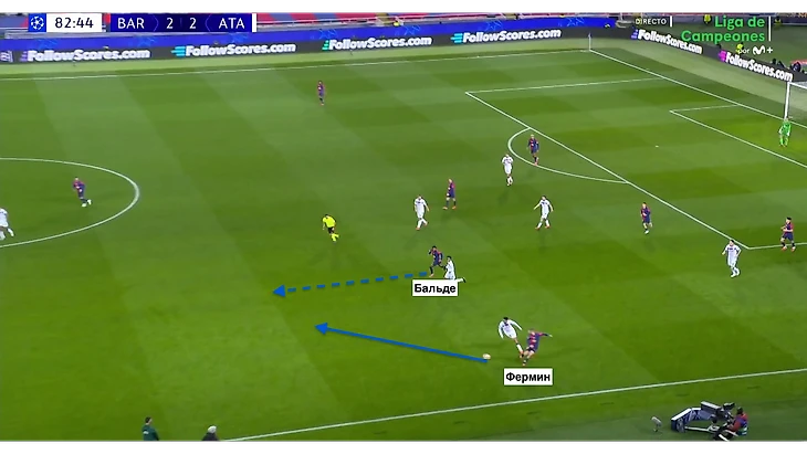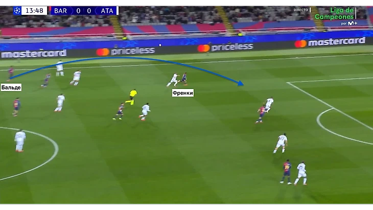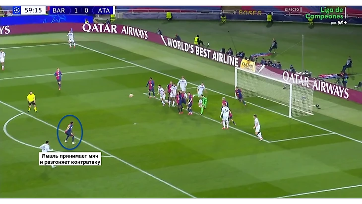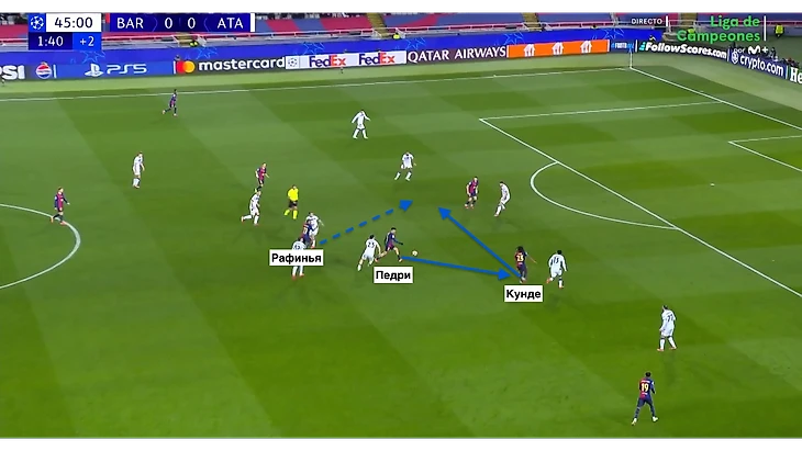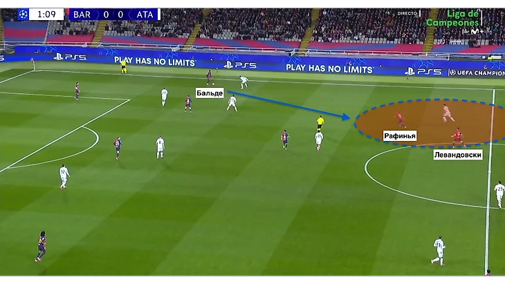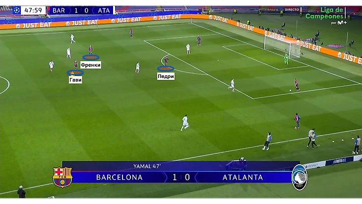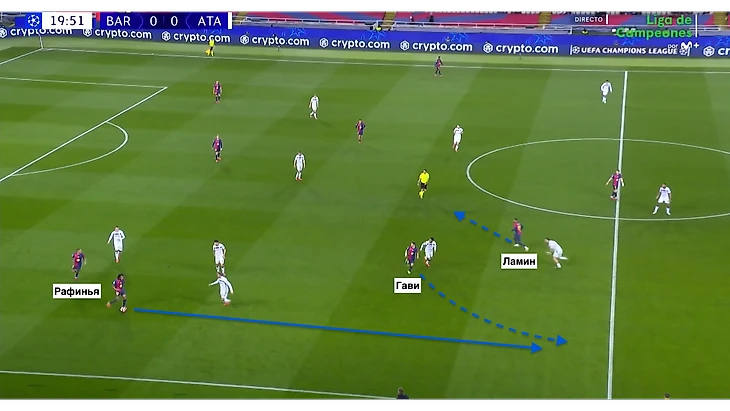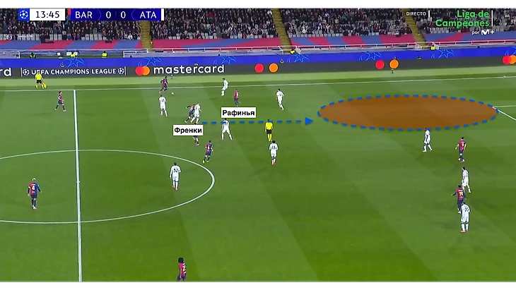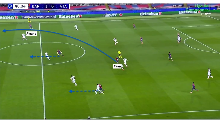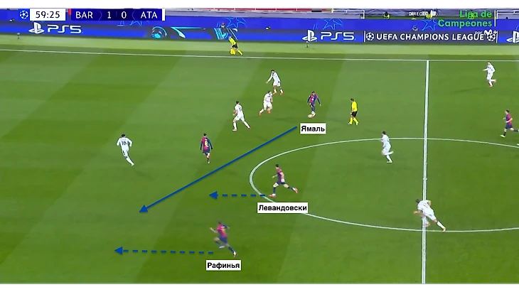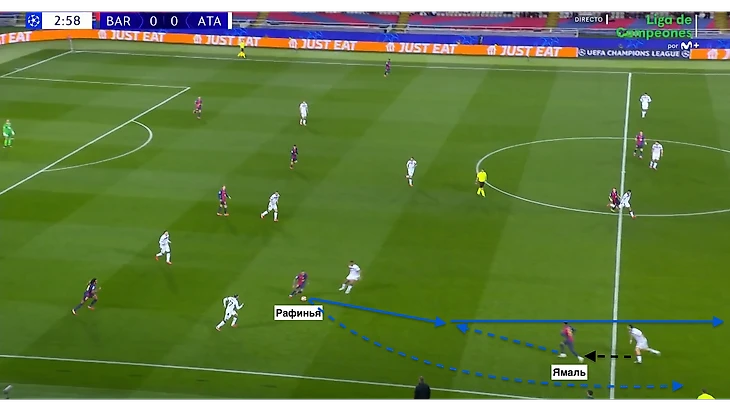 Через взаимодействие с Ямалем, он вскрывает левый фланг обороны «Аталанты». Ламин открыванием уводит своего оппонента за собой, тем самым создает пространство, которое далее для развития атаки мог бы использовать Рафинья.