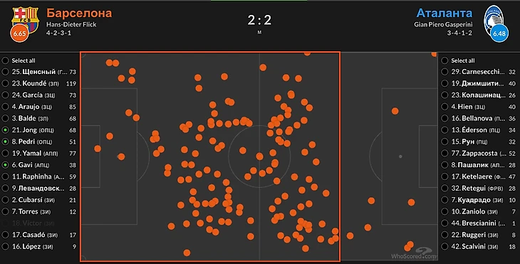 По карте касаний мяча мы можем отметить участки поля, где Гави, Педри и Френки получали мяч в этой встречи.