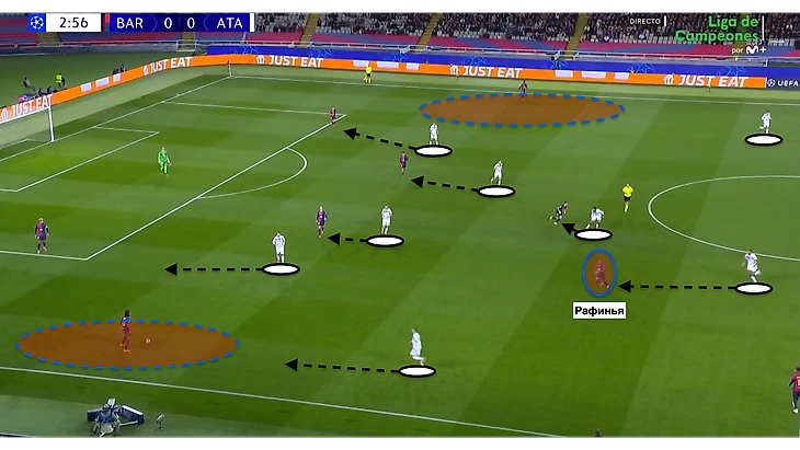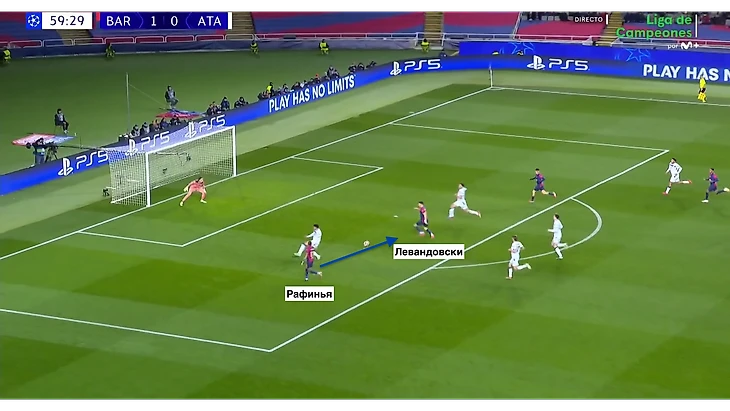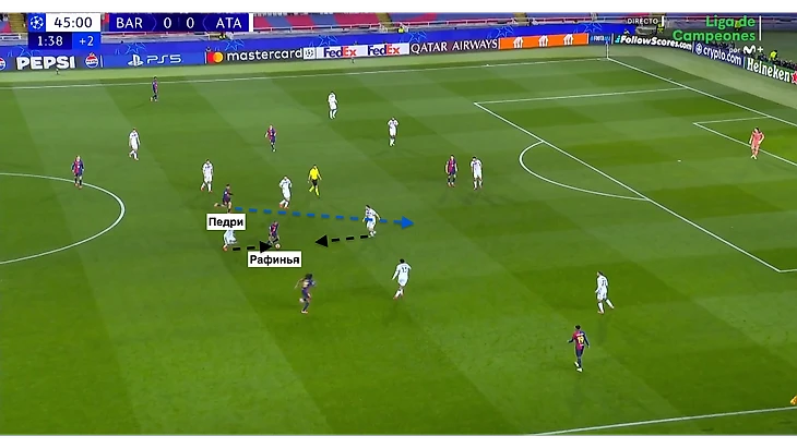 При этом видим, что при развороте атаки имеется открытое пространство на противоположном краю поля (на него указывает Педри), образовавшееся в результате смещения большого количества игроков «Аталанты» на фланг. Но оставшийся на своей позиции Рафинья не стал заполнять открытую зону.